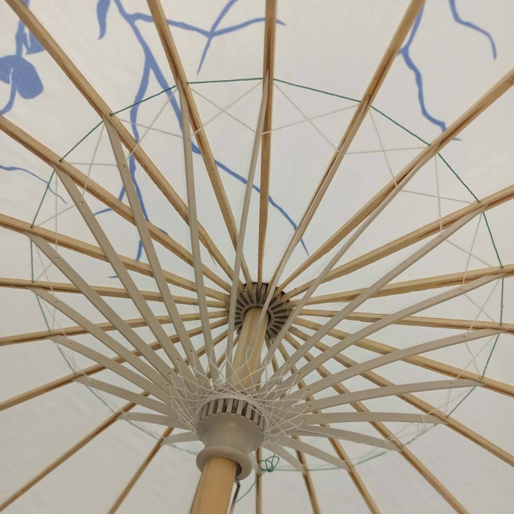 Каркас зонтика выполнен из дерева,купол зонта изготовлен из водоотталкивающего материала,который не пропускает воду.
