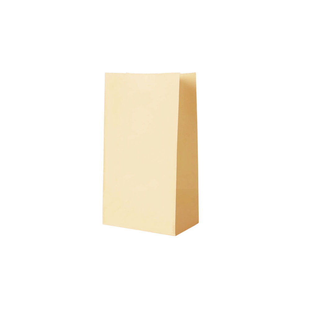 Подарочный пакет из крафтовой бумаги пастельного оттенка с белыми бумажными ручками и белой внутренней стороной.